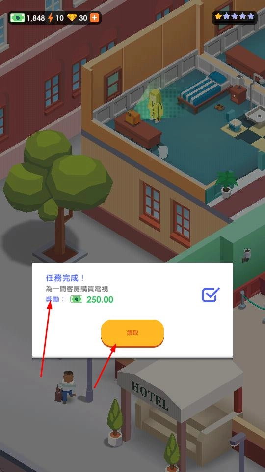 完成像给客房购置电视这类任务后,点击领取按钮,就能得到对应的金钱奖励,这些奖励可用于酒店的后续建设和发展。