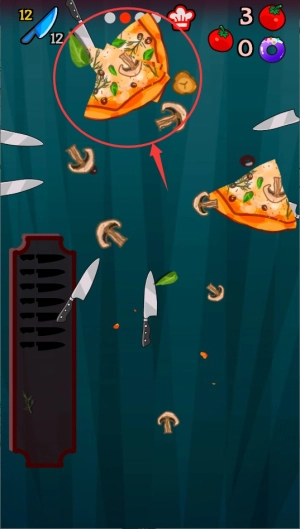快速点击发射按钮甩出飞刀,精准把控角度与力度,让刀刃稳稳嵌入水果表面的空隙中以完成得分。
