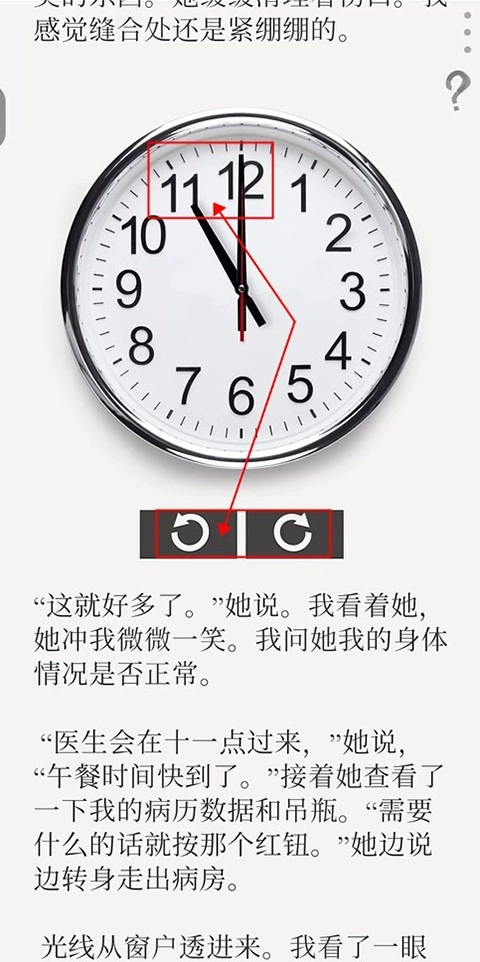 护士告知医生将于十一点前来,需将时钟调整到11:00(按钮1用于控制分针逆时针转动,按钮2用于控制分针顺时针转动),之后继续推进剧情。