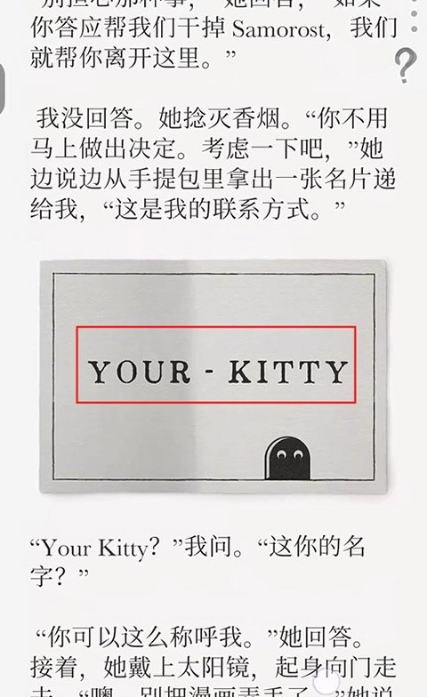 kitty,接着输入三次“火星”,从和DEBBIE的对话能知道需要拨打名片上的号码,而名片上只有YOURKITTY,因此推测用九键输入法来对应输入字母的数字:Y?、O?、U?、R?、K?、I?、T?、T?、Y?。