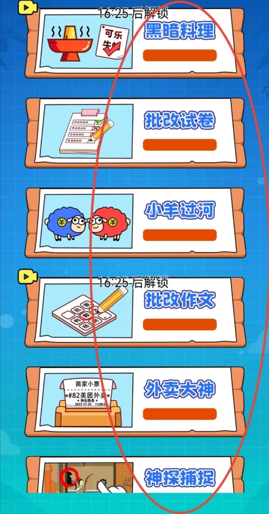 游戏主界面设有多种模式选项,涵盖试卷批改、渡河挑战、配送任务等,部分玩法需满足特定条件才可解锁体验。