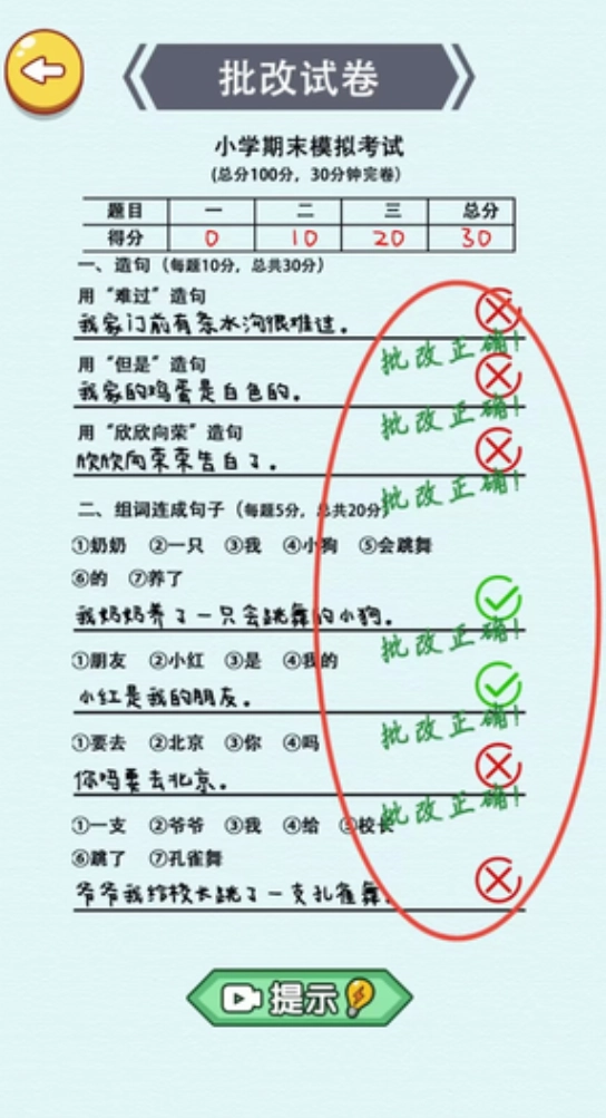 选定具体模式就能开启游戏,比如选择试卷批改模式时,得按照要求完成批阅,之后系统会自动校验批改的准确性。