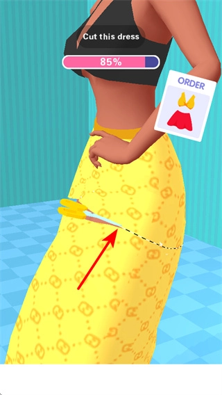 用剪刀工具顺着虚线精准裁剪服装面料,裁剪这一环节是打造服装造型的关键步骤,通过细致的裁剪能使服装轮廓贴合订单要求的样式,从而推动整体设计流程向前推进。