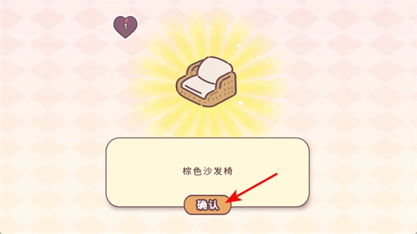 当你获得棕色沙发椅这类新家具后,点击确认按钮来确认领取该家具,它就会被添加到可布置的家具列表中。