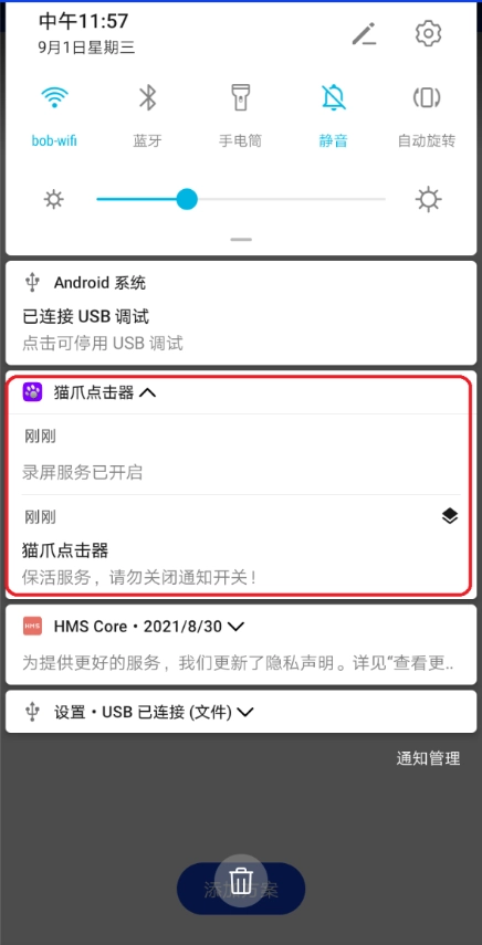 运行方案期间,通知栏顶部显示的通知(见下图)请不要关闭——这个通知是用来向系统表明“程序仍在运行,请不要终止进程”,这一点非常关键!有些用户可能觉得通知栏的通知影响视觉体验就关闭了通知权限,但这样会对点击器的稳定运行造成不利影响。