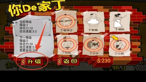 丁小小射弹弓(优先升级)+丁老妈丢拖鞋(次优先)+丁自裤丢哑铃(最末)+丁小没丢爆竹(第3优先,第6关以后使用),按照这个顺序绝对能通过前六关。