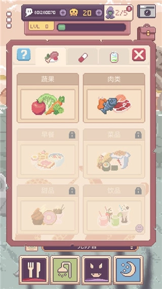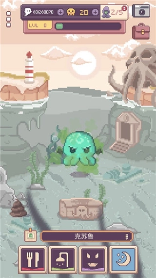 克苏鲁宠物2运用像素风格的画面,场景设计简洁,呈现出典型的独立小游戏风格,游戏的美术表现较为简约,同时带有Q萌的特点。