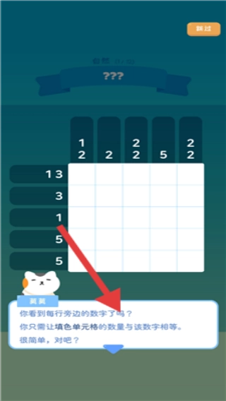 在数涂玩法的教学界面里,跟着箭头指示阅读提示内容,弄清楚要让填色的单元格数量和每行旁边标注的数字保持一致这一规则后,就可以开启游戏了。