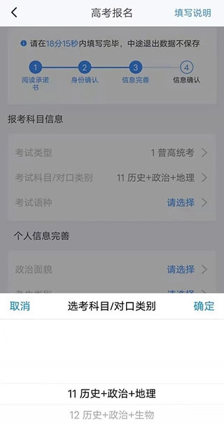 选择高考报名,看到提示需要在指定时间内填写完毕。