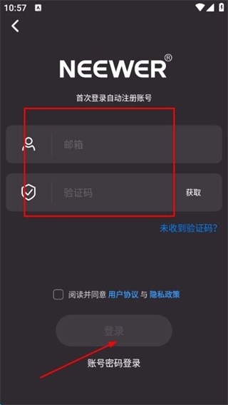 在登录页面输入邮箱与验证码,勾选相关协议后,点击登录按钮即可完成账号登录流程。