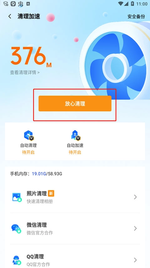 【清理加速】一键释放内存空间,深度清理后台运行的进程以及无用的缓存文件,助力手机运行更加流畅顺滑。