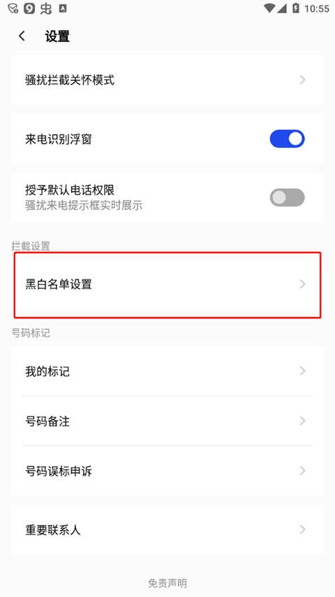 用户可在“黑白名单设置”栏目里进行相关设置,添加需要拦截的号码。