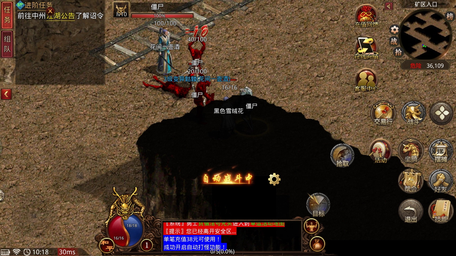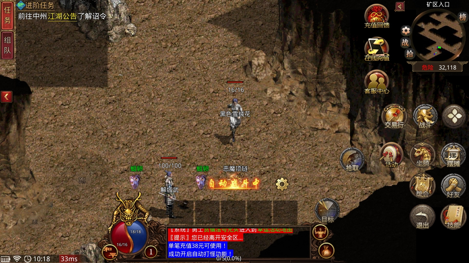 完成新手任务后,记得前往矿区把新手除魔任务做完。每个险恶区域的地图都有对应的任务可接,能获得大量经验值!这个任务支持累计,今天没时间做的话,明天也可以补做。