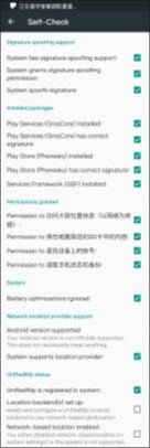 打开microG框架,进入microG设置界面,确认Self-Check的显示效果与以下内容一致;
