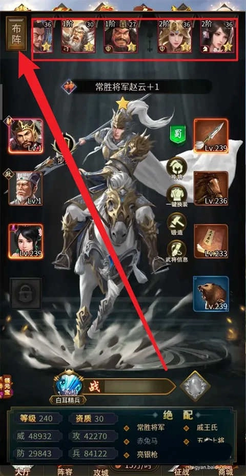 接着在弹出的阵容搭配界面里点击左上角的【布阵】按钮,然后挑选前后排的参战角色,这里建议选择赵云、张飞、甄姬和小乔这几位角色。