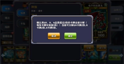 使用【一键分解】功能,能够把玩家当前持有的卡组里,SR、R、N品质且数量超过3张的卡牌一次性分解完成,每种卡牌仅保留3张。
