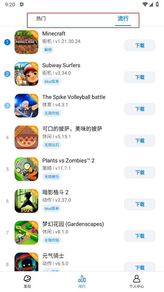 在"排行"里面随时查看热门和流行的游戏榜单信息。