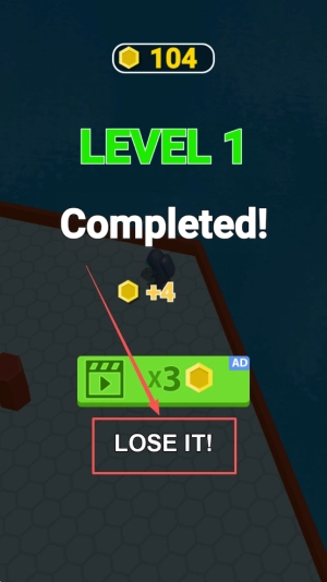结算奖励:出现LEVEL 1 Completed! +4 X3,点击AD翻倍或LOSE IT!直接领取。