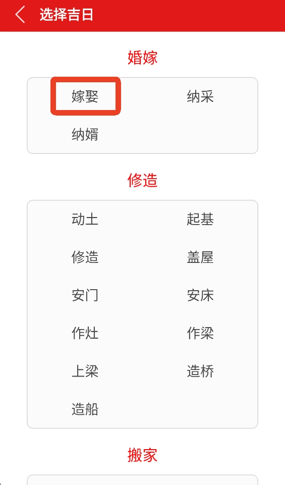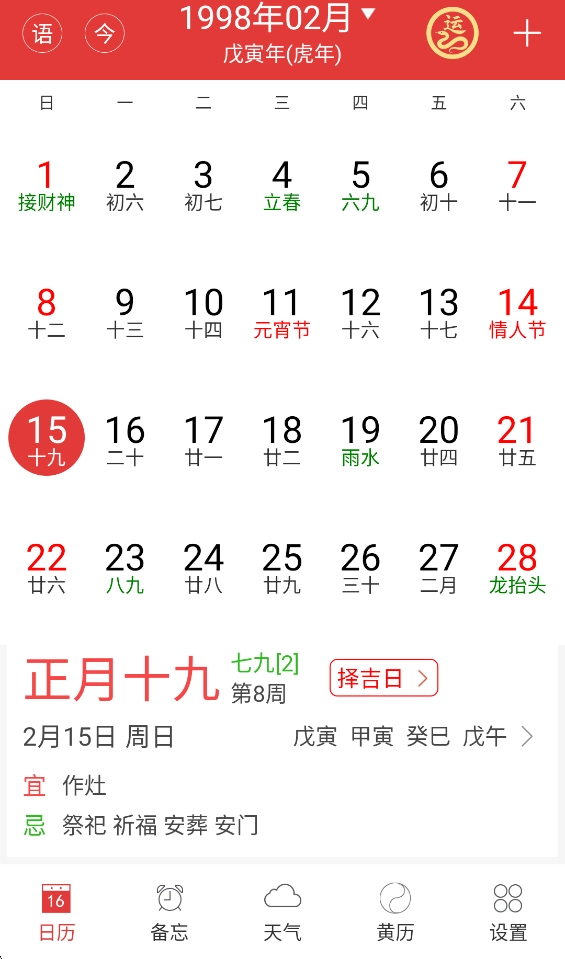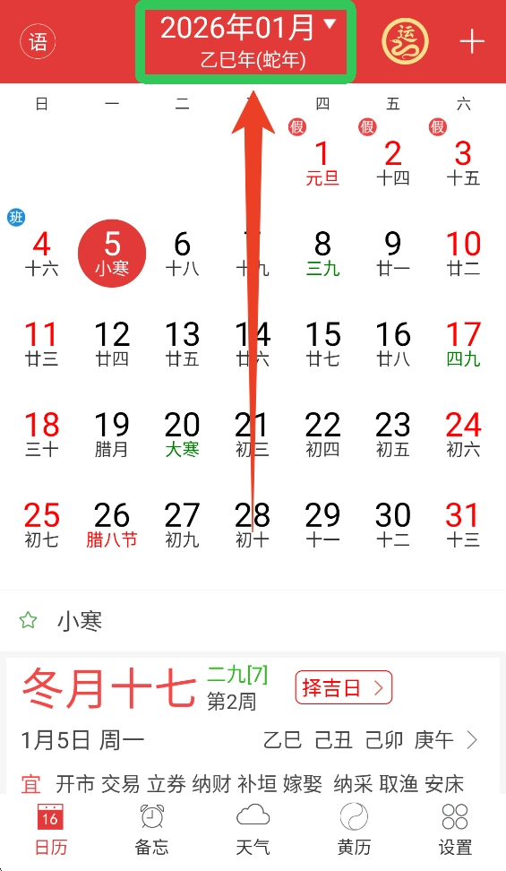 如图所示,系统会自动跳转到日历页面,日历上标注红色圆圈的日期即为朴实吉日。