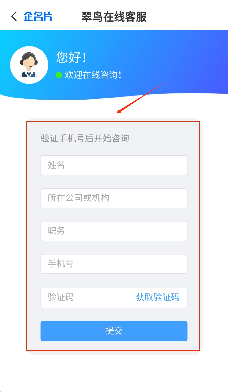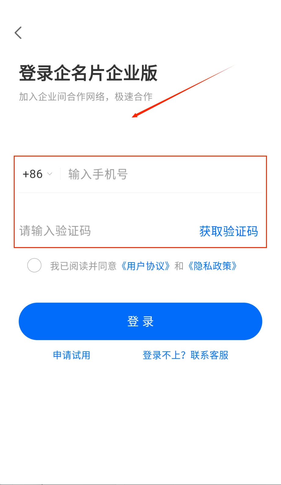 打开进入登录页面后,顶部会显示时间,中间位置是“登录企名片企业版”的标题,下方需要先选择+86的区号,然后输入11位的手机号码。