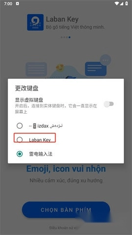 若您希望使用拼音输入法,可在“Bảng phím chính”选项卡内选择“拼音”输入法。如此便能顺利切换Laban Key越南版的中文输入模式了。