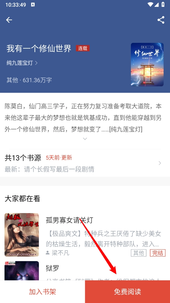 进入小说详情页面后,点击“免费阅读”按钮即可进入阅读界面。