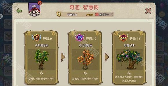 四级以上的智慧树能够采集到树叶,合成七级以上的智慧树时有概率产出雨林,我们的目标是刷出至少一个一级雨林。