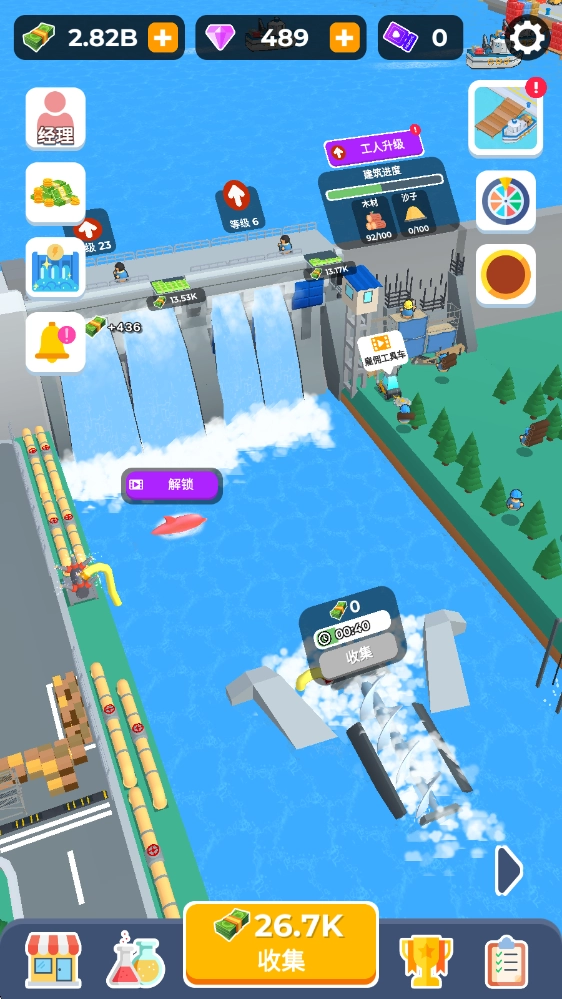 大坝建造者(Dam Builder)是一款休闲有趣的模拟经营游戏。在游戏中,玩家将前往水库周边区域,着手建设属于自己的大坝,并通过精心管理持续对其进行建造与升级,从而获取更多财富。除了建造大坝本身,玩家还能在大坝周边搭建码头、水力发电机等各类设施,这些设施将带来更为丰富的收益,助力玩家积累更多财富,以便更好地打造专属大坝!
