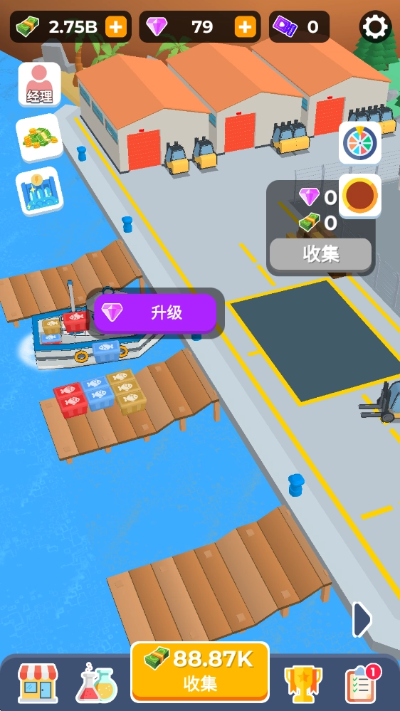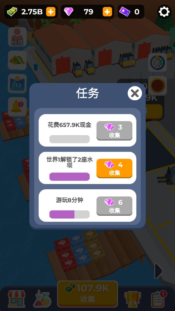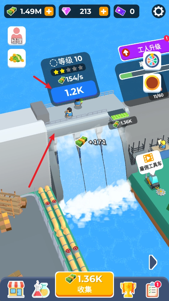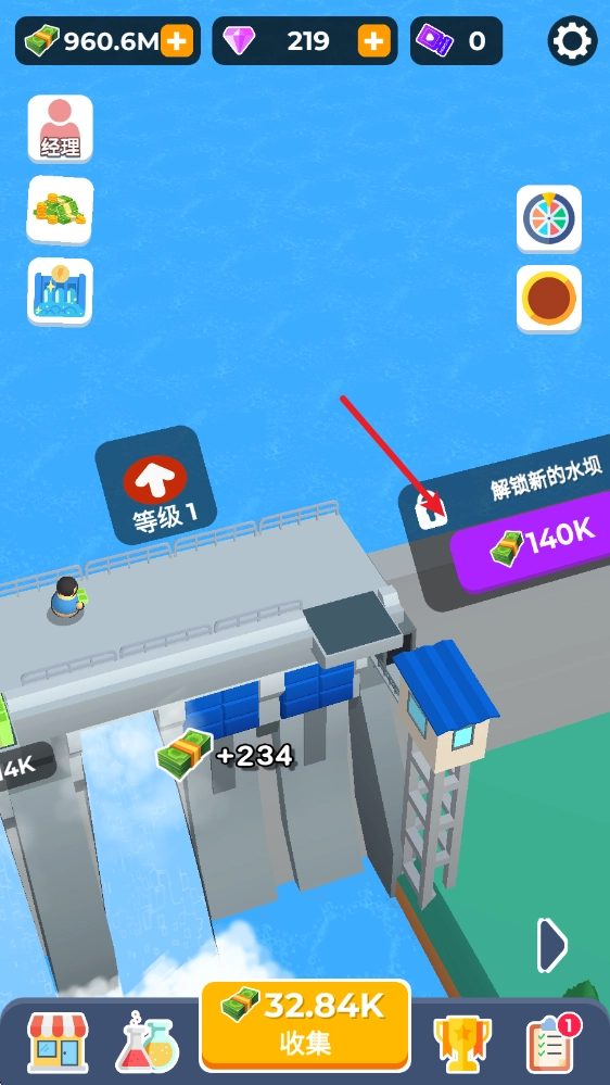进入游戏后,能看到自己的初始大坝,点击它就能进行升级,从而提升收益。