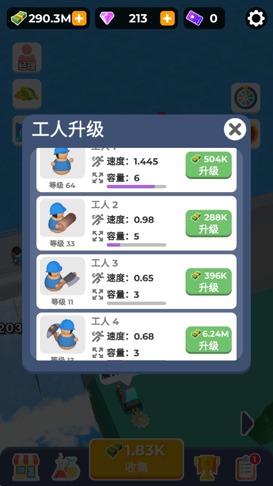 我们能够招聘员工负责建造工作,还可以通过对员工进行升级来加快建造速度。