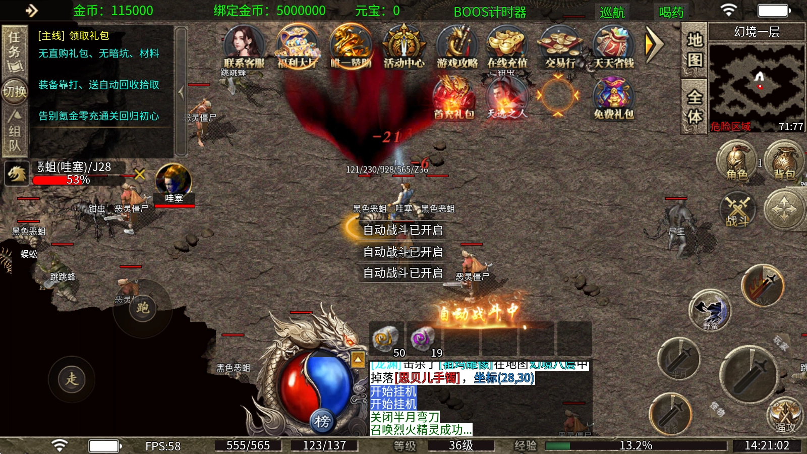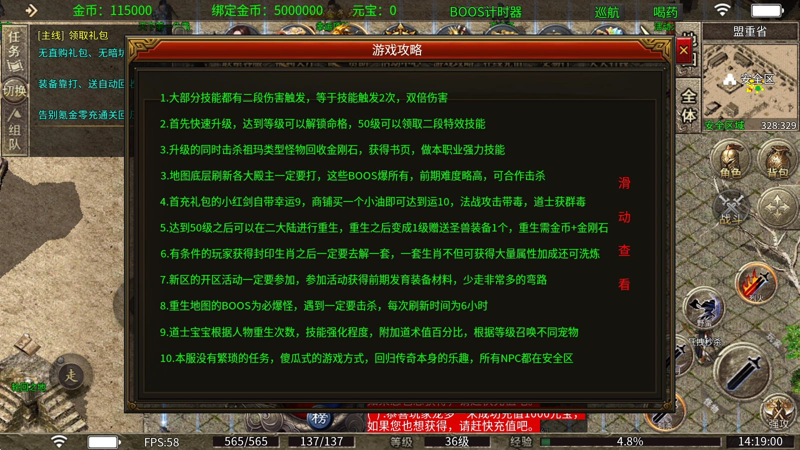 本服摒弃繁杂任务,采用简单易上手的游戏模式,让玩家重拾传奇最初的乐趣,所有NPC均设置在安全区内。