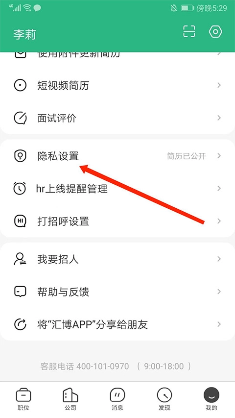 进入设置界面,滑动右边圆点,即可隐藏简历。