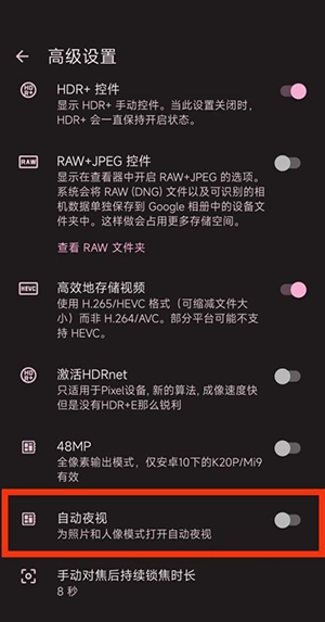 随后我们就可查看到谷歌相机中的自动夜视该选项了