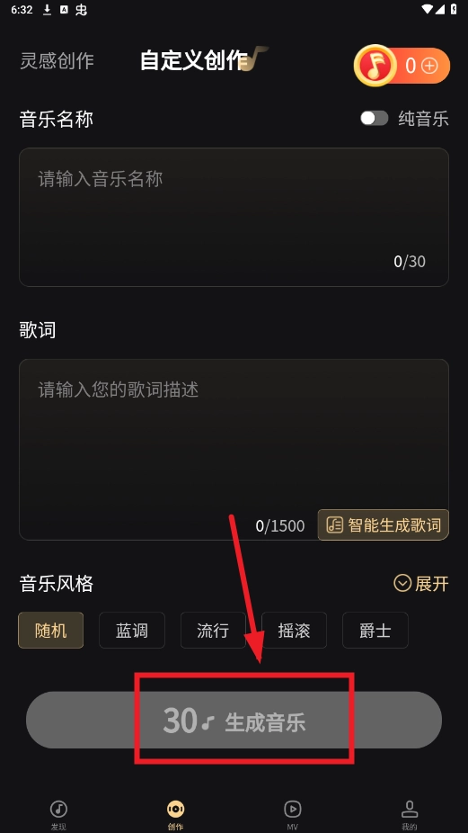 在输入框中填入灵感描述,点击生成音乐按钮。