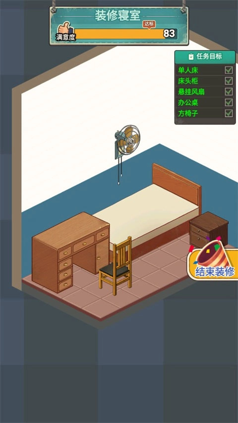 将家具摆放整齐,完成上方的任务目标即可结束装修;