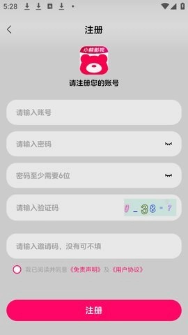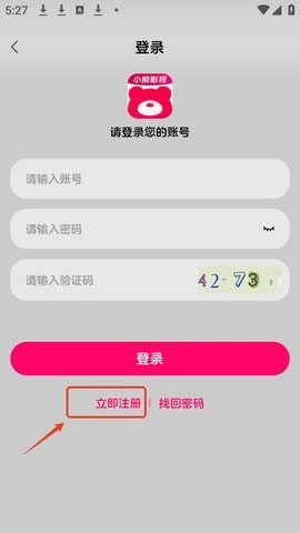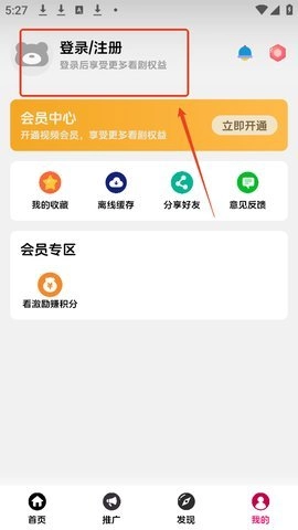 打开小熊影视应用,点击界面右下角的“我的”选项,接着点击页面上方的登录/注册按钮。