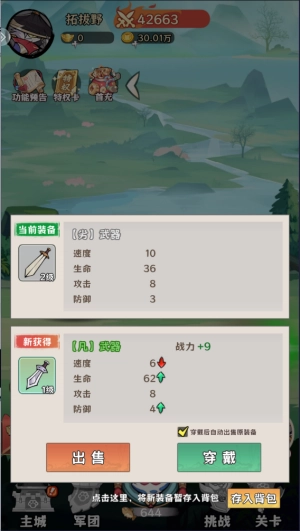 每次战胜敌人都会获得装备奖励,你可以先查看装备属性,再决定是否更换当前装备;如果对获得的装备不需要,还能直接将其售卖。