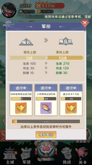 完成特定任务后,军衔会得到提升,等级上限也能随之突破,从而获取更强大的属性加成。