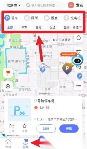 驻车页面支持查看停车点、厕所、充电桩及景点的分布情况,用户能够依据自身需求进行筛选,并规划合适的停留点。