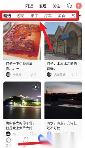 发现页面设有精选、游记、亲子等标签,用户既能浏览他人分享的内容,也能借助打卡功能记录自己的行程。