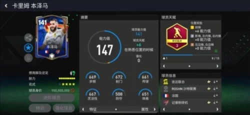 在数据特性上,这张本泽马的总评是141,天赋加成让他的传球数据达到了661,在前场球员里处于领先位置;667的灵活性数据,也足够支撑他在小区域内完成灵活的传控跑动。同时,搭配团队领袖、组织者、团队型球员这些特性,本泽马的传控配合会更流畅,能更好地和队友打出精彩的配合。