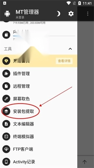 打开MT管理器,点击左上角选项并点击安装包提取;