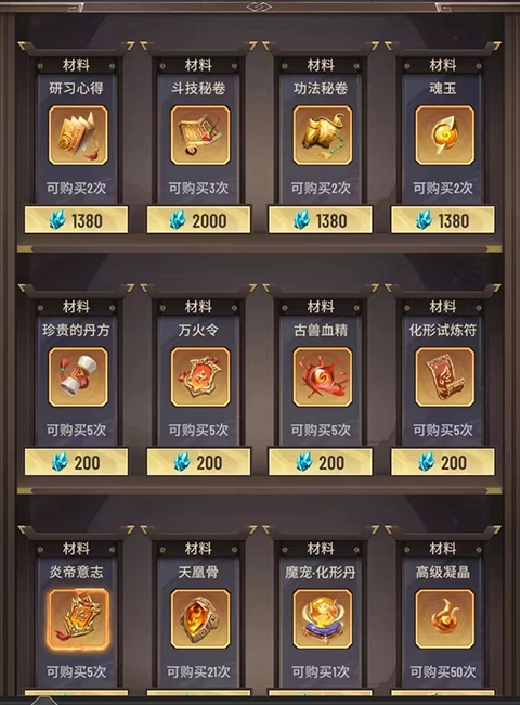 秘药和古龙香是一定要入手的道具,用玉石刷1-2次就行,不过后面价格太高了,不建议经常买(氪金玩家想怎么买都行)。等突破到大境界后,商店会刷新,到时候还能再买。