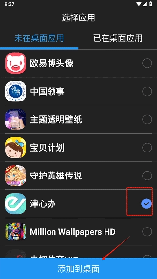 在所有应用页面中,点击右上角的三条横线图标,接着选择“添加应用到桌面”选项。