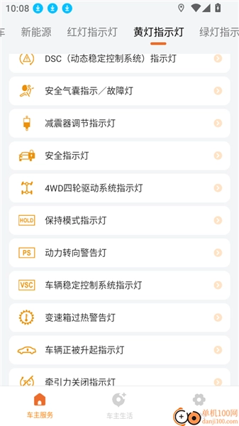 在软件首页下滑找到“保险”功能模块,接着左滑点击“黄灯指示灯”按钮,即可进入下一步操作。
