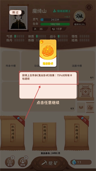 在掌握【鬼谷卦术】之后,借助75%的卡包透视功能,优先挑选高价值的卡包进行开启,以此快速积攒高品质卡牌,从而提升自身修为。