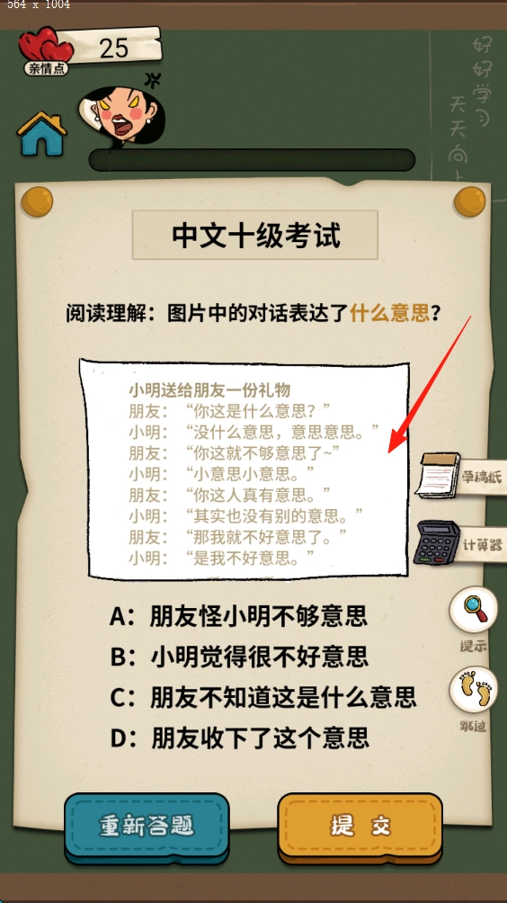 中文考试的关卡里,需要阅读对话来理解其中的意思,接着选择正确的选项,最后提交以完成答题。
