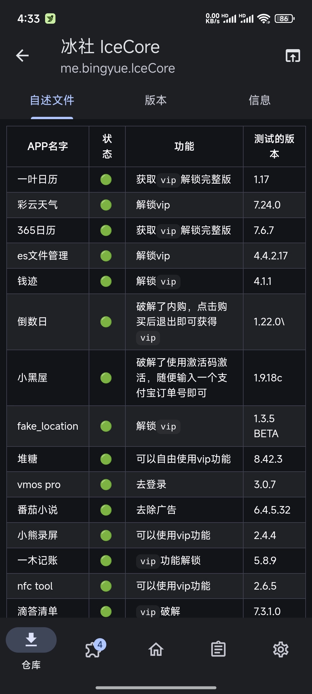 冰社模块拥有Xposed模块的常规特性,也就是可以在不改动APK源代码的前提下,借助编写专属模块来改变APK的运行行为。IceCore整合了各类实用功能,像获取VIP权限、移除广告等都包含在内。这些功能让用户在使用部分软件时能拥有更优质的体验。