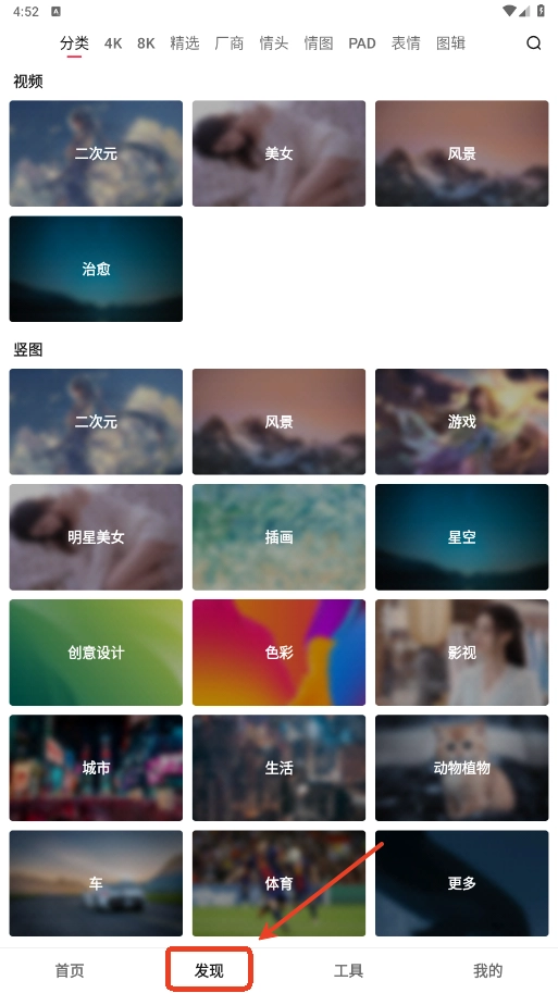 打开应用后,你会在“发现”页面看到二次元、风景、游戏、明星等多个分类的壁纸选项。你可以通过滑动屏幕或点击不同分类,来浏览自己喜欢的壁纸。