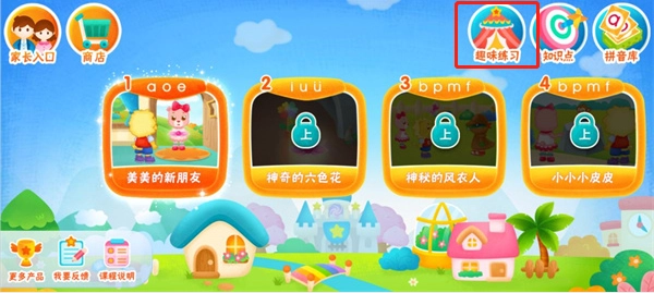 选择关卡时,右上角设有“趣味练习”“知识点”和“拼音库”三个功能入口。